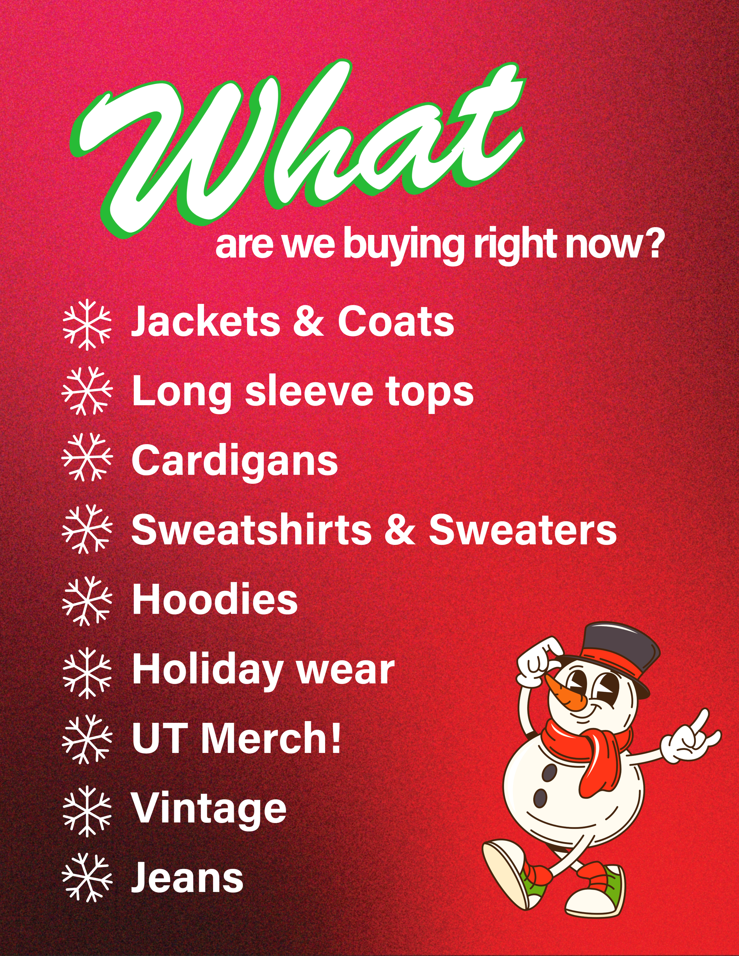 We buy current and sought after clothing and accessories. Some of the things our buyers look for are: